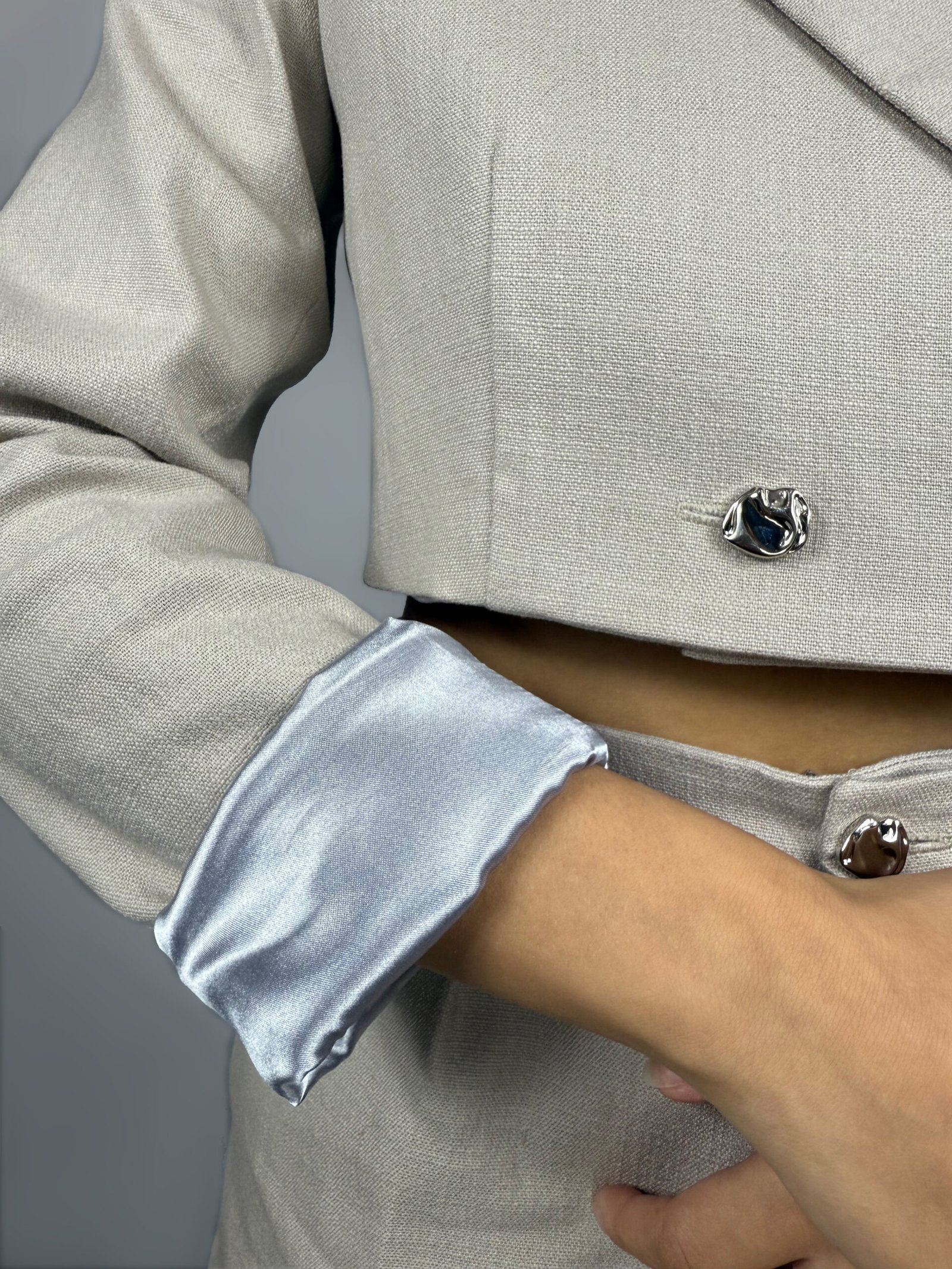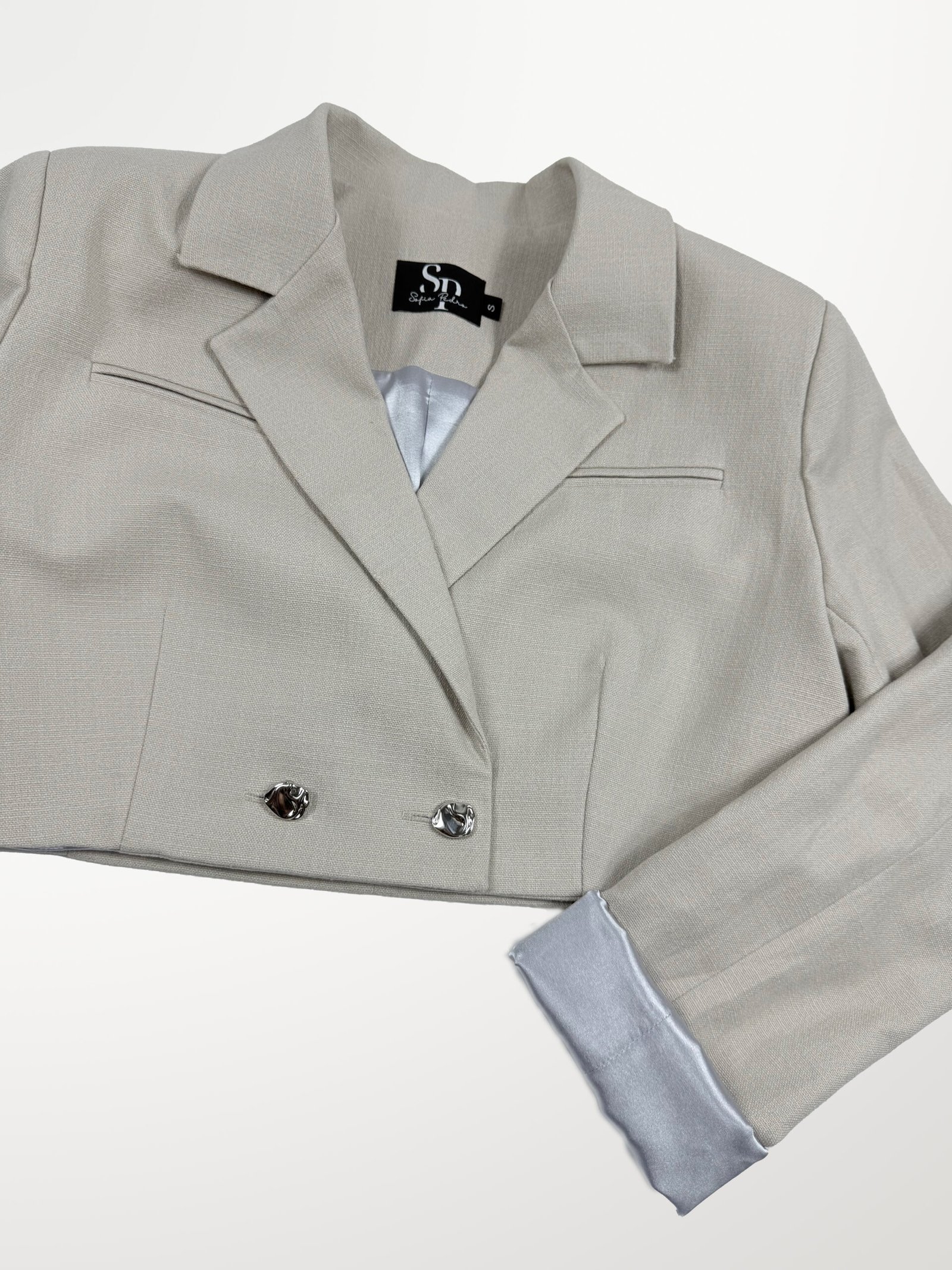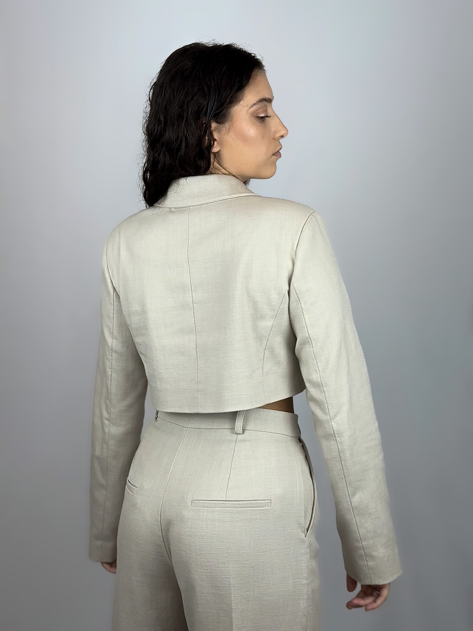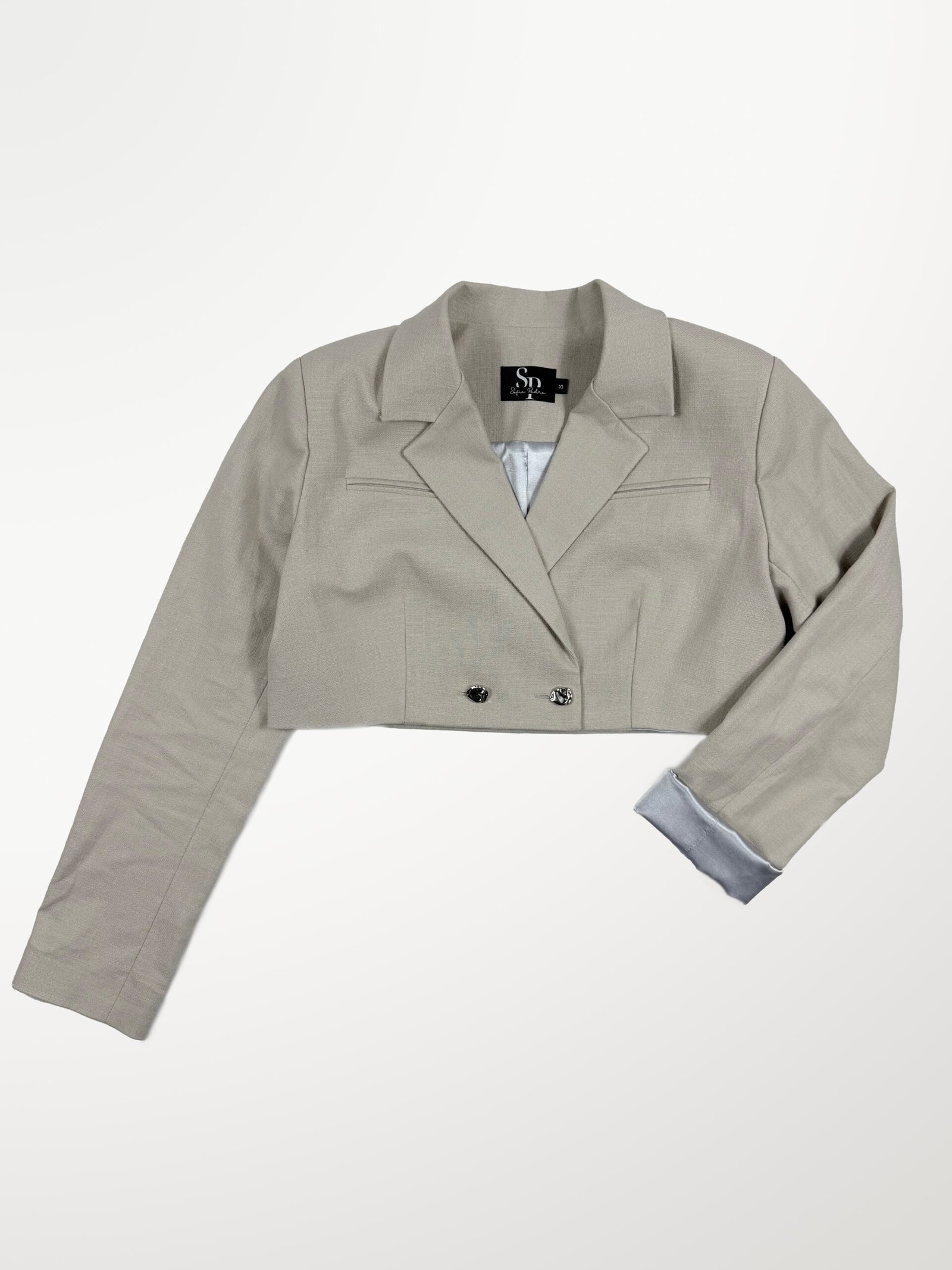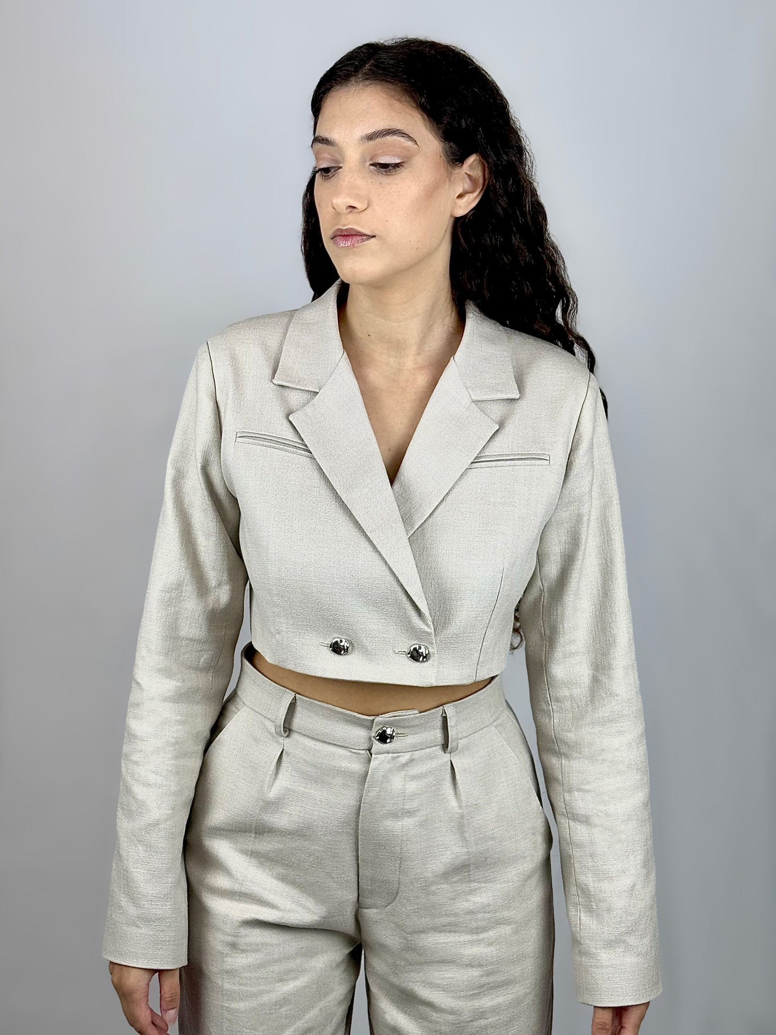 Blazer confecionado em linho de alta qualidade. Blazer curto de gola e lapela, com manga comprida e ombreira. Fecho frontal cruzado com dois botões metálicos. Blazer com forro acetinado de cor cinza.