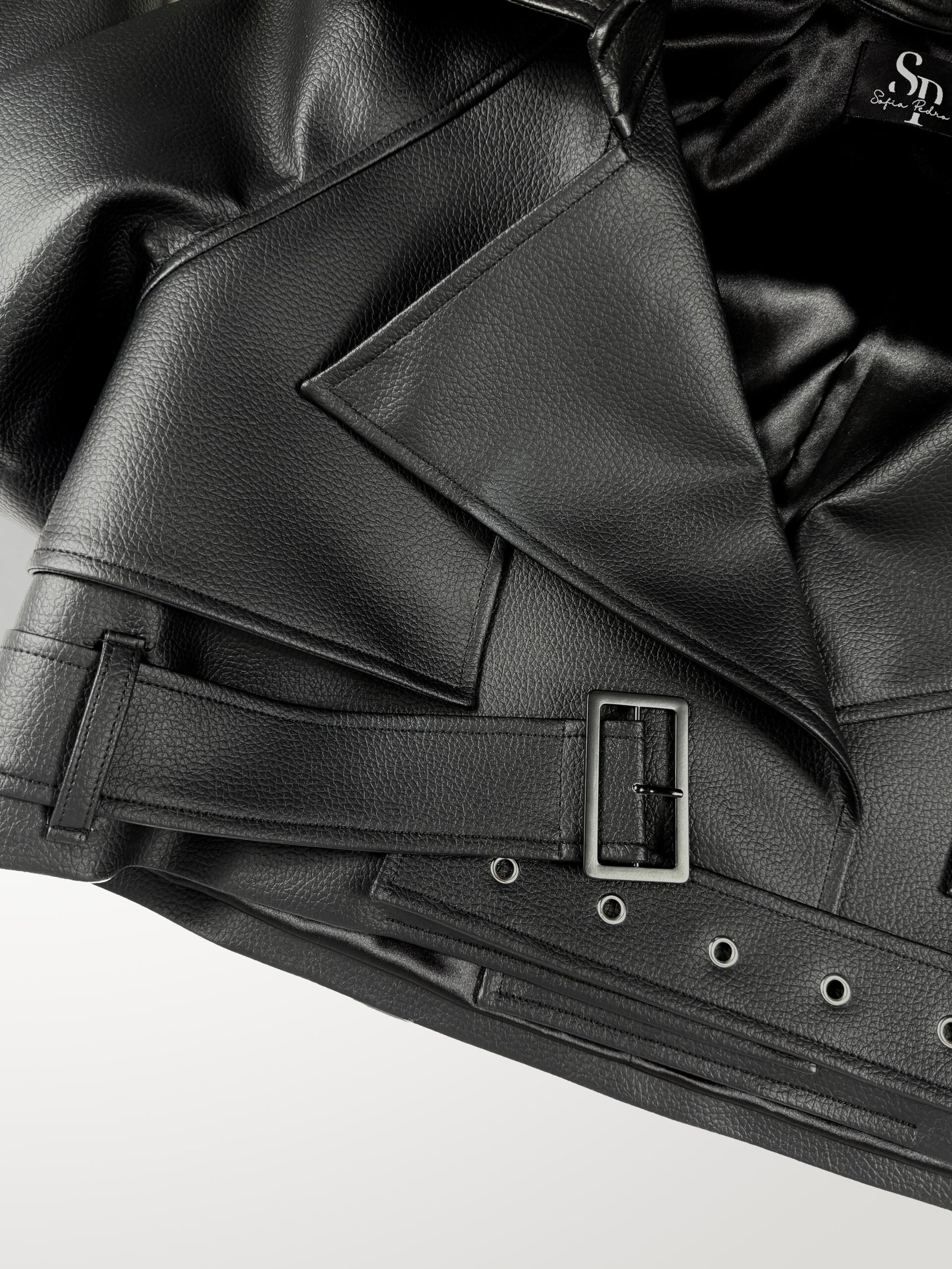 Blusão confecionado em napa com efeito de pele. Blusão com gola de abas, colarinho e manga raglan comprida com ombreira. Palas na frente e nas costas. Cinto confecionado no mesmo material com fivela metálica. Forro acetinado.